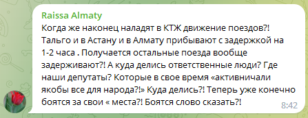 "Люди не могут выехать по направлению Астана — Алматы. И им даже не могут сообщить точное время выезда. Говорят, просто ждать. От 2 часов, а может, больше. Люди просят дать хоть какой-нибудь комментарий, вот только представители КТЖ молчат", — говорится в сообщении.