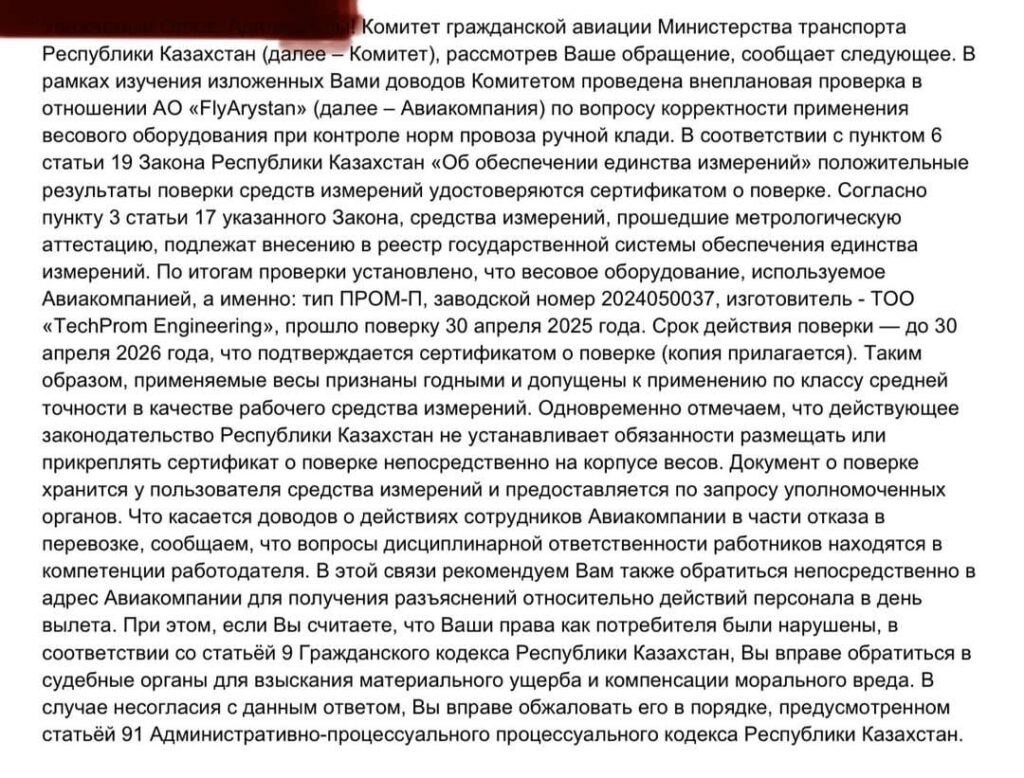 «Круто и правильно, что вы пошли до конца. Ладно, сертификат, а оттиск поверительного клейма должен был быть приклеен на самих весах. QR, чтобы сканировать и видеть, действительно рабочие весы или нет. Надо требовать.  500-600 граммов очень нелогично считать за перевес, учитывая погрешность +/-.  Вообще ненавижу FlyArystan, и сотрудницы хамки, орут до потери голоса, даже если все ок. Но приходится летать, по работе особенно».