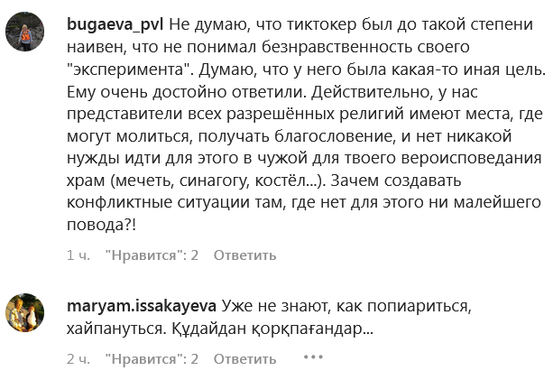 Парню отказали и в церкви, и в мечети, а также провели разъяснительную беседу. В частности ему пояснили, что представителя другой религии пустили бы для молитвы, если бы в городе не было храма его конфессии. Тогда бы он мог совершить христианскую молитву в мечети и намаз в православной церкви. Однако в Павлодаре есть и то, и другое, поэтому специально отказываться от них нет смысла, тем более ради лайков.