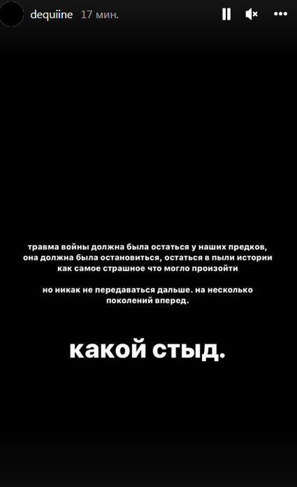 "Страдают обычные люди. Реальные люди теряют семьи, дом, почву под ногами, работу, близких, все, что им дорого. У них есть лица, у них есть дети, история, мамы, папы, и у них всего одна жизнь. Травма войны должна была остаться у наших предков. Она должна была остановиться, остаться в пыли истории как самое страшное, что могло произойти. Но никак не передаваться дальше. На несколько поколений вперед. Какой стыд", — написала певица в сторис.