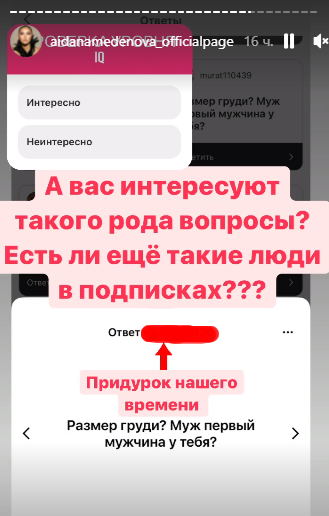 А после её спросили: "Размер груди? Муж первый мужчина у тебя?" Меденова прокомментировала это: "Придурок нашего времени". А потом спросила: "А вас интересуют такого рода вопросы? Есть ли ещё такие люди в подписках?"