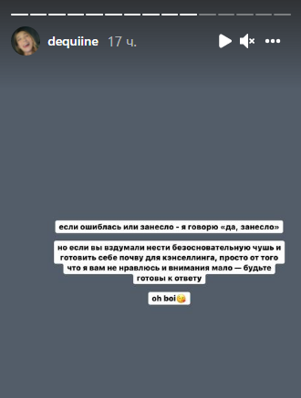 Также она написала: "Если ошиблась или занесло, я говорю: "да, занесло". Но если вы вздумали нести бессознательную чушь и готовить себе почву для кэнселинга, просто оттого что я вам не нравлюсь и внимания мало, будьте готовы к ответу".
