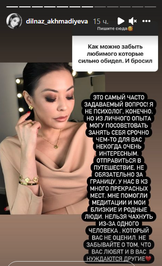 Дильназ ответила: "Я не психолог, конечно, но из личного опыта могу посоветовать занять себя срочно чем-то для вас некогда очень интересным. Отправиться в путешествие, не обязательно за границу, у нас в Казахстане много прекрасных мест. Мне помогли медитации и мои близкие и родные люди. Нельзя чахнуть из-за одного человека, который вас не оценил. Не забывайте о том, что вас любят и в вас нуждаются другие".