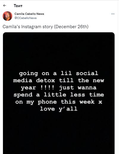 — Иду в небольшую детоксикацию от социальных сетей до нового года!!! Просто хочу провести меньше времени в телефоне на этой неделе. Люблю всех, — говорится в послании певицы.