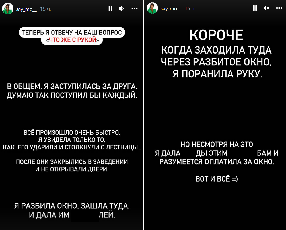 Во время прямого эфира в TikTok артистка писала комментарии с просьбами о помощи, пока ее куда-то везли, передает Сaravan.kz. Стало известно, что Say Mo пришлось обратиться в больницу, где ей наложили швы на руку, но в остальном она чувствует себя хорошо и уже успела дать концерт в Усть-Каменогорске. Теперь она рассказала свою версию случившегося.
