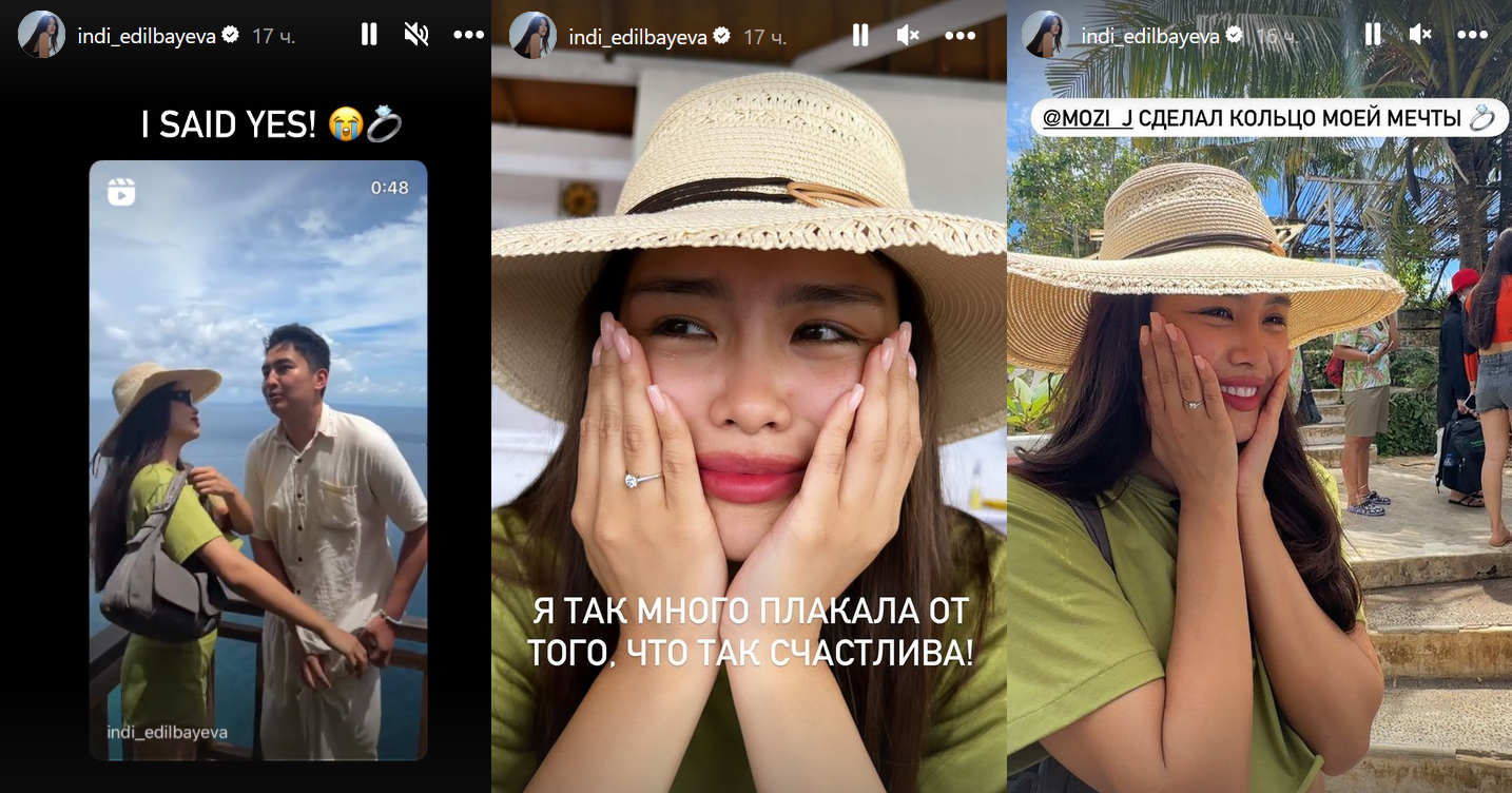 Артистка поделилась деталями в социальных сетях, передает медиа-портал Сaravan.kz. Она со своим избранником, продюсером Камалдином, путешествовала по Бали. На обзорной площадке одного из островов мужчина достал из кармана кольцо и вручил Индире. Она заплакала от неожиданности. Камалдин сказал, что искал красивое место для предложения, и это кажется ему подходящим.