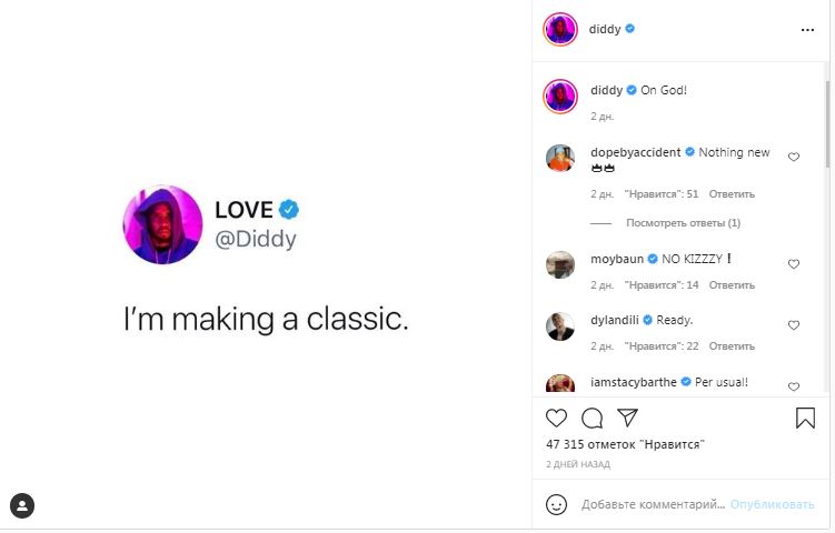 Напомним, в 2019-м Пи Дидди отметил пятидесятилетие. Вечеринку по случаю его юбилея посетили Бейонсе, Джей-Зи, Dr. Dre, Леонардо Ди Каприо, Кайли Дженнер, Канье Уэст и Ким Кардашьян в винтажном платье Vivienne Westwood.