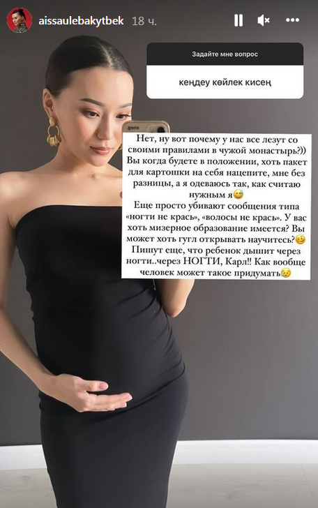 "Нет, ну вот почему у нас все лезут со своими правилами в чужой монастырь? Вы когда будете в положении, хоть пакет для картошки на себя нацепите, мне без разницы, а я одеваюсь так, как считаю нужным я. Еще просто убивают сообщения типа "ногти не крась", "волосы не крась". У вас хоть мизерное образование имеется? Вы, может, хоть гугл открывать научитесь? Пишут еще, что ребенок дышит через ногти… Через ногти, Карл! Как вообще человек может такое придумать", — прокомментировала ситуацию Айсауле, сопроводив текст снимком в черном вечернем платье.