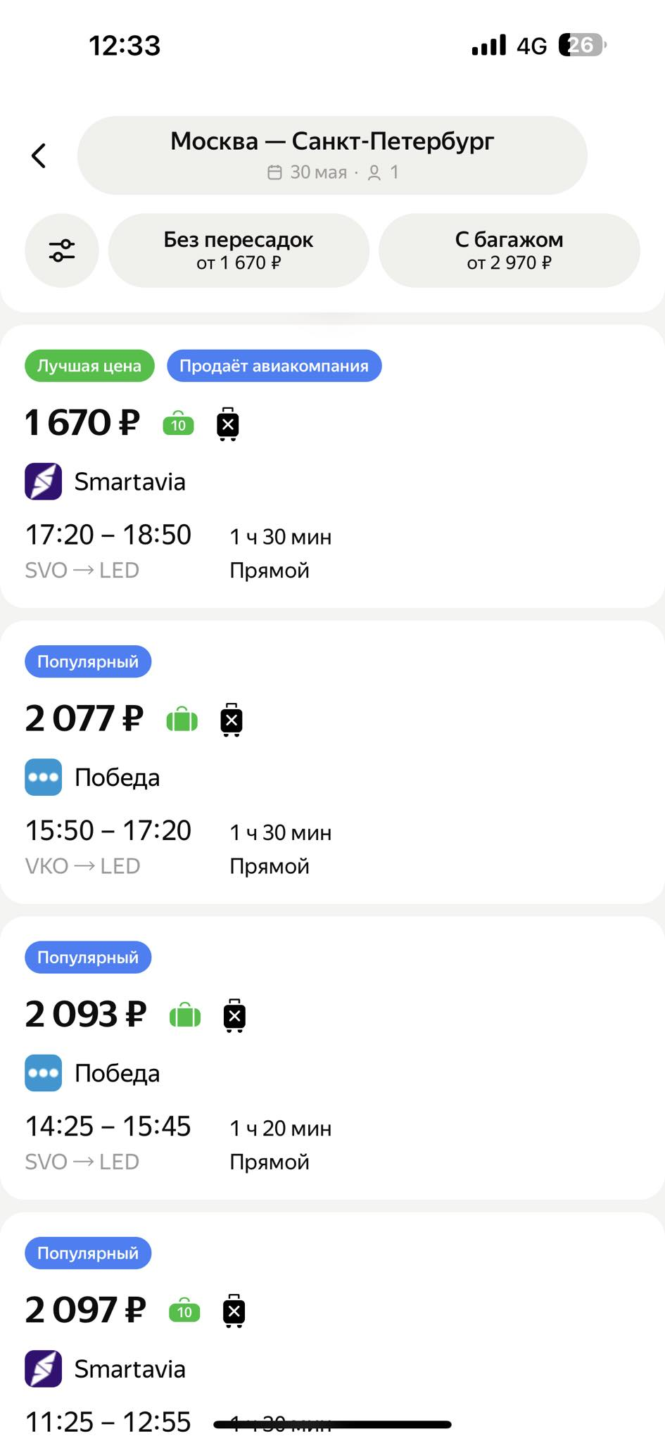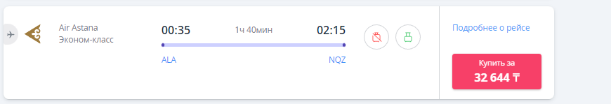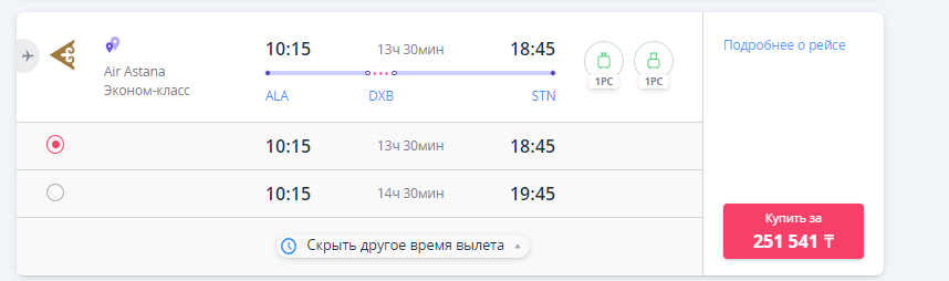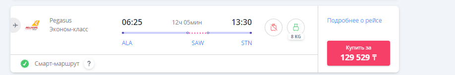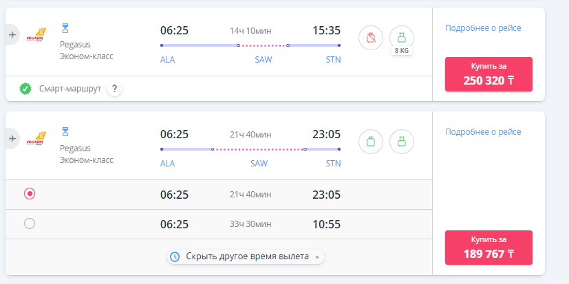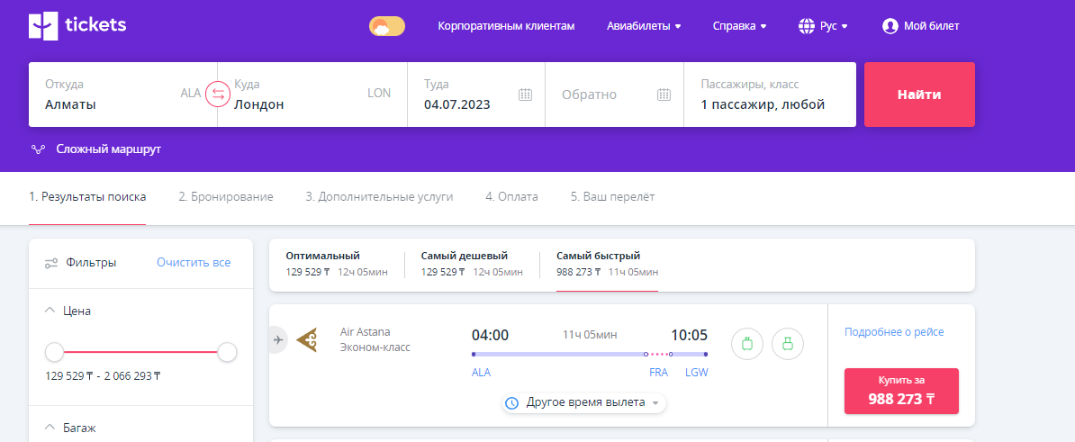 А уже на 4 июля картина следующая: цена самого дешёвого билета от Pegasus — около 129 тыс. тенге (падение в цене более чем на 40 тыс. тенге), а самого дешёвого от Air Astana — 251 тыс. тенге (подешевел всего на 21 тыс. тенге), однако самый быстрый билет (всё так же от Air Astana) уже стоит почти миллион тенге, при том, что это эконом-класс.