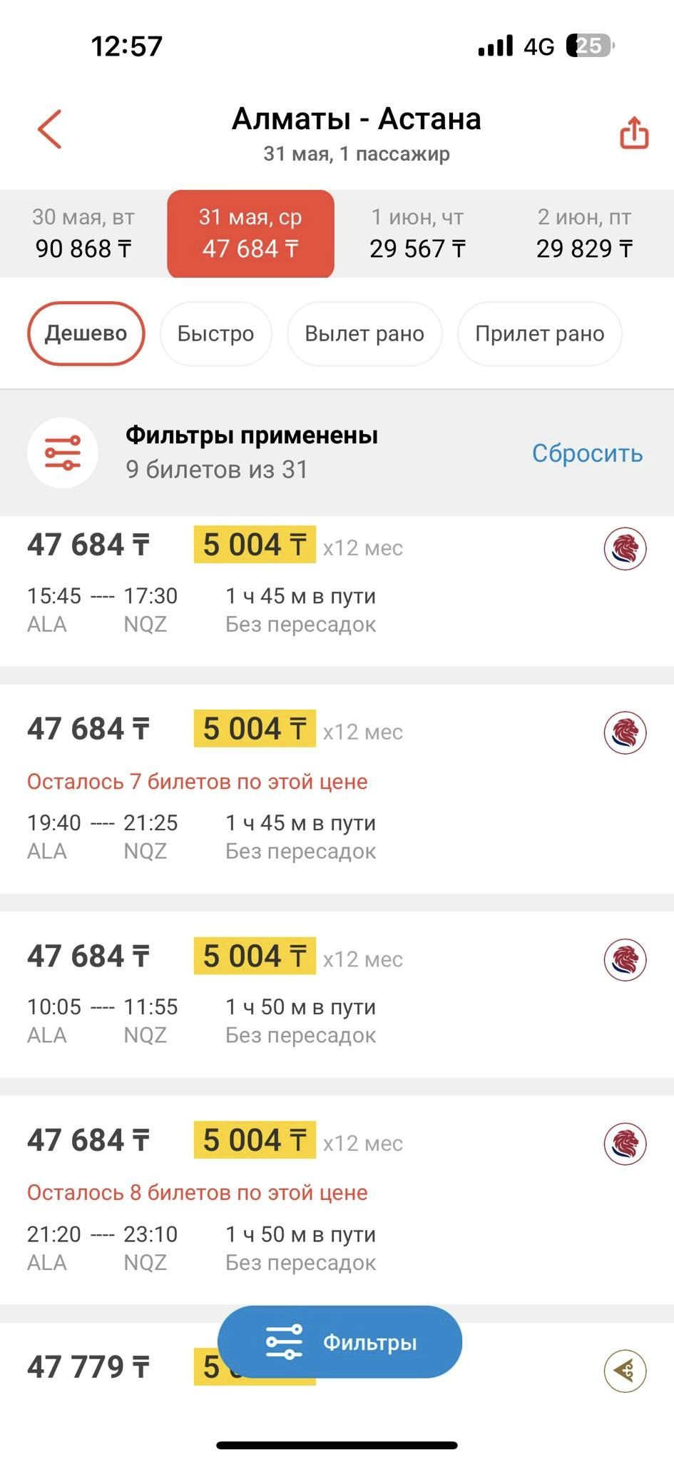 Как будто более ровно обстоят дела с билетами из Алматы в Астану: 4 июня билет Air Astana стоит 46 тыс. тенге, хотя самый быстрый оказывается дешевле и стоит 31 тыс. тенге (от Scat):