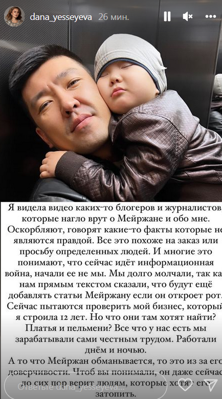 "Многие это понимают, что идет информационная война, начали ее не мы. Мы долго молчали, так как нам прямым текстом сказали, что будут еще добавлять статьи Мейржану, если он откроет рот. Сейчас пытаются проверить мой бизнес, который я строила 12 лет. Но что они там хотят найти? Платья и пельмени? Все, что у нас есть, мы зарабатывали сами, честным трудом. Работали днем и ночью. А то, что Мейржан обманывается, то это из-за его доверчивости. Чтобы вы понимали, он даже сейчас до сих пор верит людям, которые хотят его затопить", — написала она в сторис.