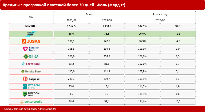 Самым успешным банком в сокращении просроченных платежей оказался Bank RBK, снизивший их на 3,4 % за месяц. В то время как кредитный портфель банка увеличился на почти 1 %, достигнув 922,4 миллиарда тенге, что свидетельствует о повышении качества портфеля. Доля просроченных более чем на 30 дней платежей в общем объеме займов банка составила всего 3,8 %, в сравнении с 3,96 % в предыдущем месяце. В целом по банковскому сектору этот показатель составил 4,41 %, что немного выше, чем 4,36 % в предыдущем месяце.