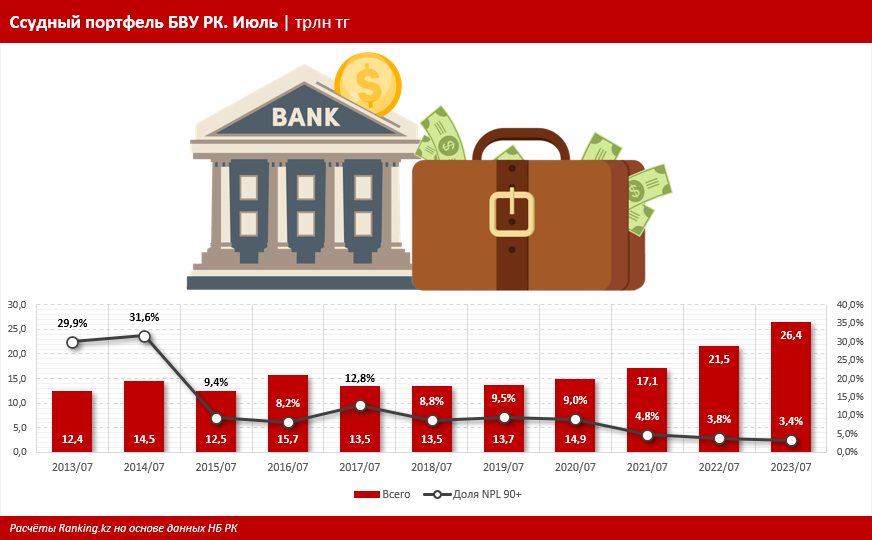 В годовой динамике ссудный портфель банков в Казахстане вырос на 22,5 %, при этом объем просроченных более 90 дней платежей увеличился на 7,4 %. Это привело к снижению доли просроченных платежей более 90 дней в общем портфеле ссуд до уровня, ниже чем годом ранее (тогда показатель составлял 3,84 %).