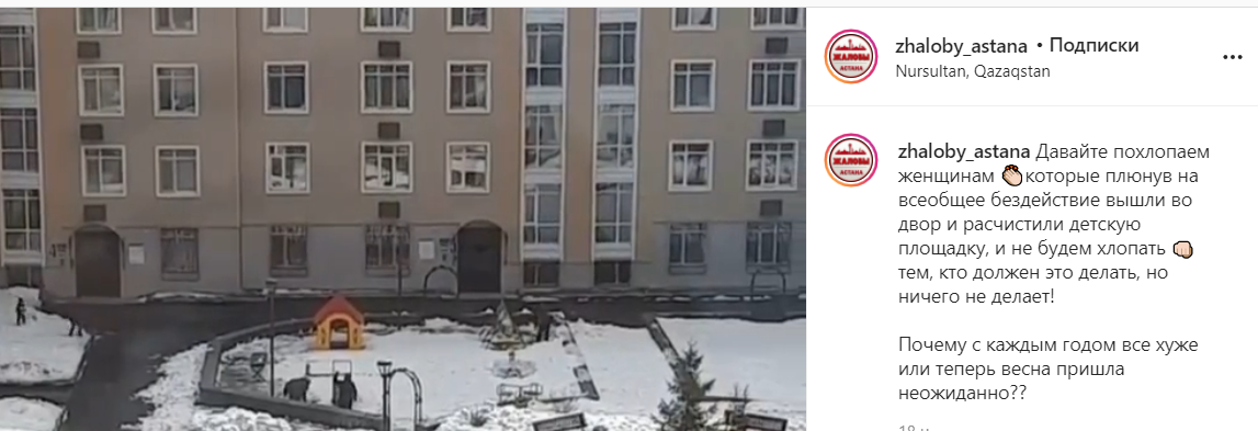 "Давайте похлопаем женщинам, которые, плюнув на всеобщее бездействие, вышли во двор и расчистили детскую площадку, и не будем хлопать тем, кто должен это делать, но ничего не делает! Почему с каждым годом все хуже? Или теперь весна пришла неожиданно?" — подписано видео в столичном паблике.