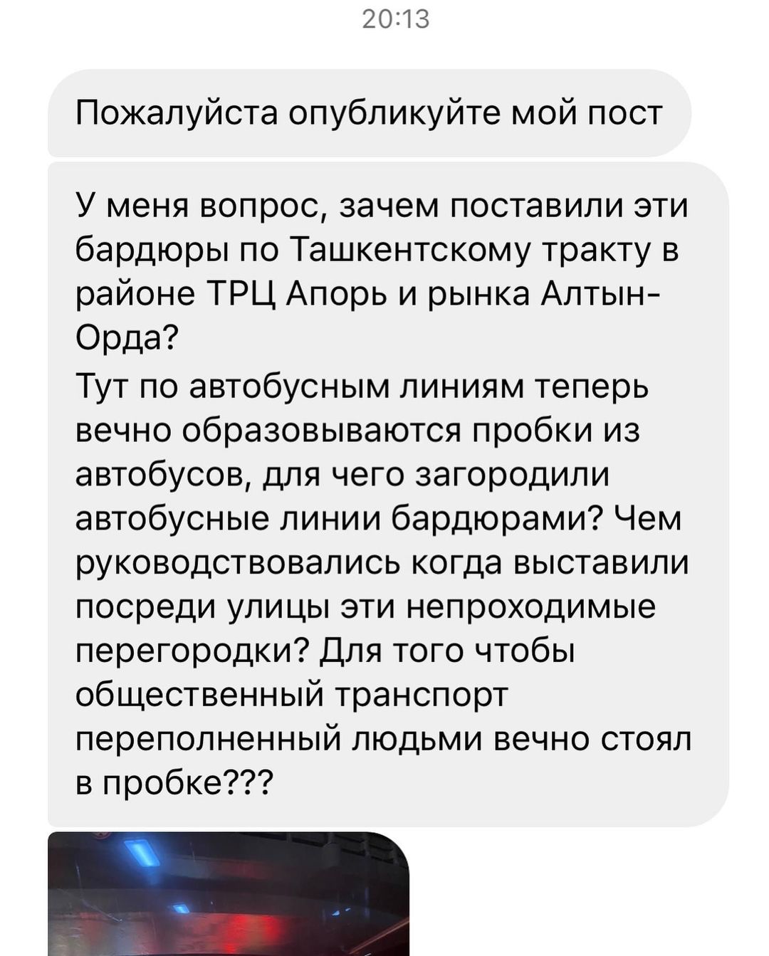 Алматинцы жалуются на неудобства, созданные при попытке решить транспортную проблему. В частности, бетонные ограждения, отделившие автобусную полосу, привели к появлению автобусных пробок.