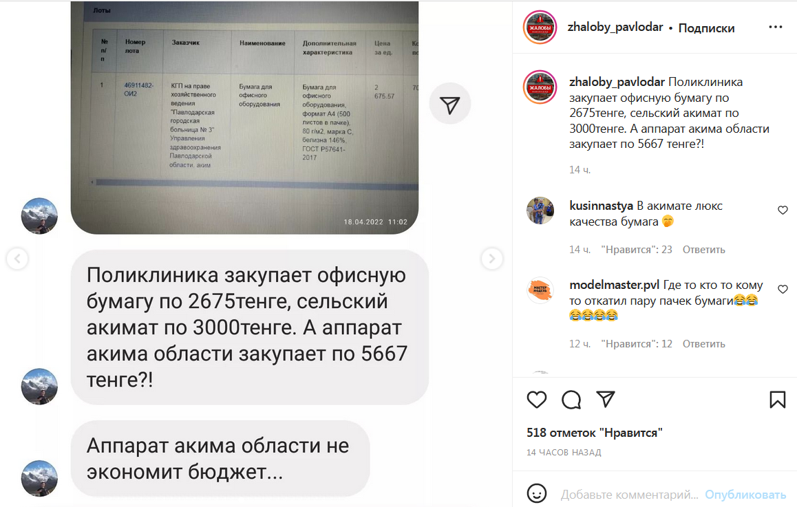 "Поликлиника закупает офисную бумагу по 2675 тенге, сельский акимат по 3000 тенге. А аппарат акима области закупает по 5667 тенге?!" — говорится в сообщении в паблике zhaloby_pavlodar.