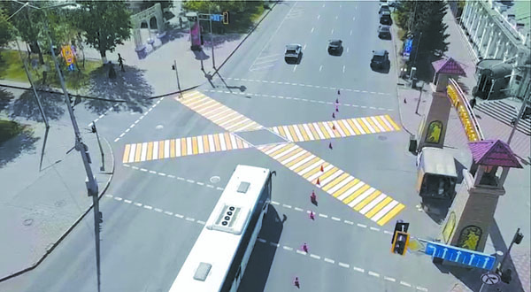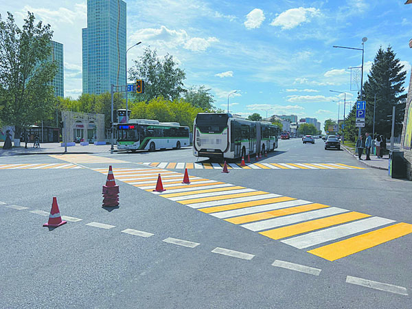В частности, пешеходная разметка в бело-желтой и красно-белой цветовой гамме, которая используется для обозначения пешеходных переходов и границ полос движения в темное время суток на нерегулируемом пешеходном переходе. Диагональная пешеходная разметка используется для увеличения пропускной способности пешеходов на загруженных перекрестках (Сейфуллина – Валиханова и Кенесары – Мамбетова); приподнятый пешеходный переход – конструкция в виде возвышения на проезжей части дороги, помогает принудительному ограничению скорости движения транспортных средств.