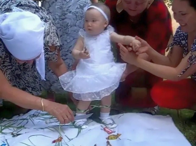 Другой ритуал, связанный с первыми шагами, сейчас почти забыт. Наши предки прокатывали между ножками малыша свежеиспеченный баурсак, стараясь, чтобы кусочек теста катился как можно дальше и быстрее. В это время мать или старшая женщина в семье читала заклинание, текст которого передавался по женской линии.
