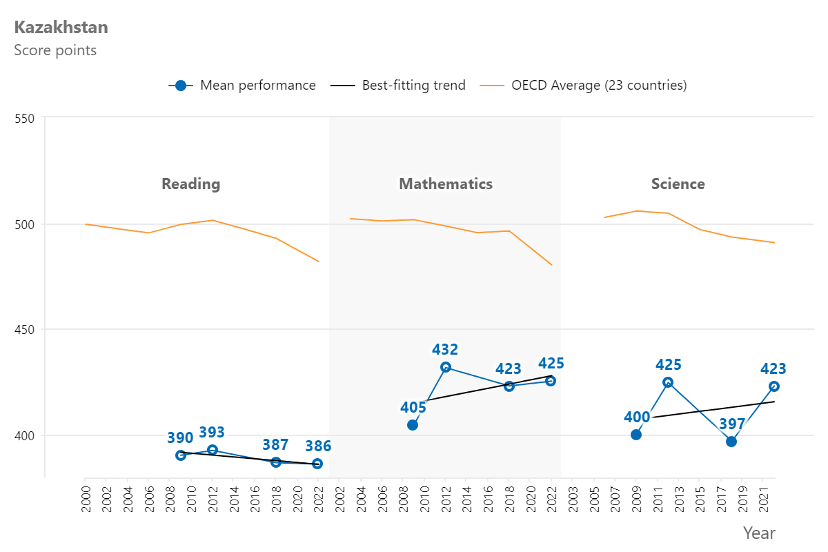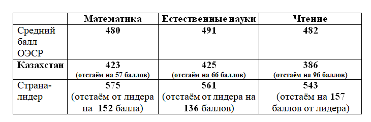 В 2018 году результаты Казахстана в тестировании PISA были признаны, но вместе с тем было отмечено общее снижение уровня грамотности учащихся. По математике было набрано 423 балла, по естествознанию – 397, по читательской грамотности – 387. Большинство учеников справилось только с первым-вторым уровнем сложности.