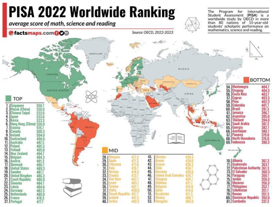 PISA – это авторитетное международное исследование, которое оценивает функциональную грамотность школьников 15 лет и их способность применять полученные знания на практике. Тестирование проводится каждые три года, и в 2022-м лучшие результаты показали ученики из развитых стран Азии: Сингапур – 560, Макао – 535, Тайвань и Япония – 533. Среди европейских стран лидирует Эстония со средним баллом 515, занимая седьмое место в мировом рейтинге, передает Caravan.kz.