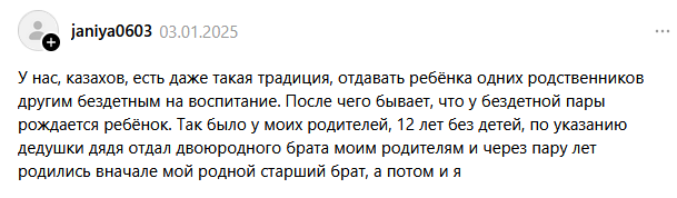«У меня есть двоюродный брат, он тоже первенец и вырос на руках у дедушки и бабушки, своих родителей он «папа» и «мама» не называет. Когда у него родился сын, где-то в 10 месяцев он его отвез в село и отдал своим родителям на воспитание».