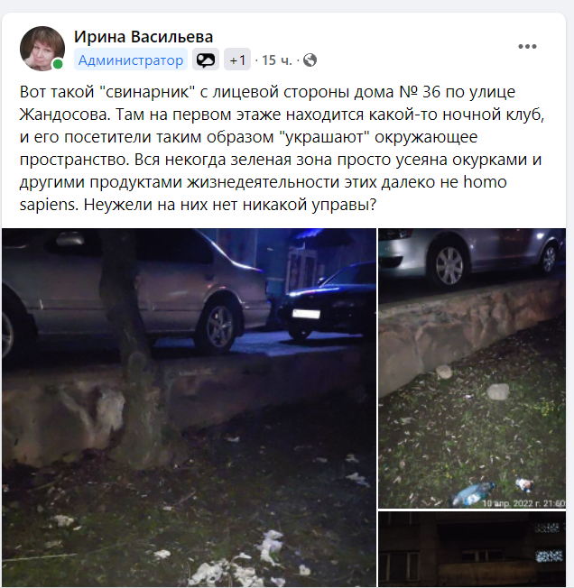 "Вот такой "свинарник" с лицевой стороны дома № 36 по улице Жандосова. Там на первом этаже находится какой-то ночной клуб, и его посетители таким образом "украшают" окружающее пространство. Вся некогда зеленая зона просто усеяна окурками и другими продуктами жизнедеятельности этих далеко не homo sapiens. Неужели на них нет никакой управы?", — написала жительница Алматы Ирина Васильева.