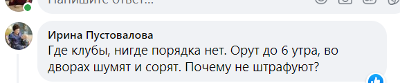 "Где клубы, нигде порядка нет. Орут до 6 утра, во дворах шумят и сорят. Почему не штрафуют? ", "Сначала штраф, потом закрытие заведения!", "Если бы был штраф в миллионы, то это заведение под угрозой закрытия начали бы сами прогонять", — пишут участники группы.