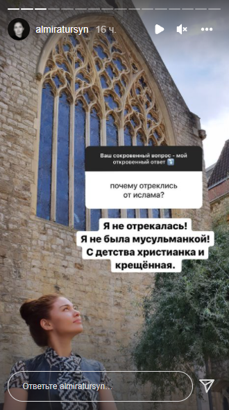 Альмира Турсын пояснила: "Я не отрекалась! Я не была мусульманкой! С детства христианка и крещёная".