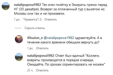 В ноябре сообщалось, что Tez Tour полностью отменил туры в Таиланд, в том числе ранее оплаченные. Вместо них клиенты могли получить поездку в Турцию или на Хайнань, где тогда был не сезон. Была и опция возврата средств, но с неприятным условием – получить деньги обратно туристы могли не раньше марта 2024 года.