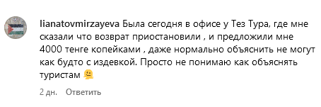 Некоторые клиенты сообщают, что возврат средств на данный момент приостановлен, а оператор предлагает в качестве компенсации 4 тысячи тенге.