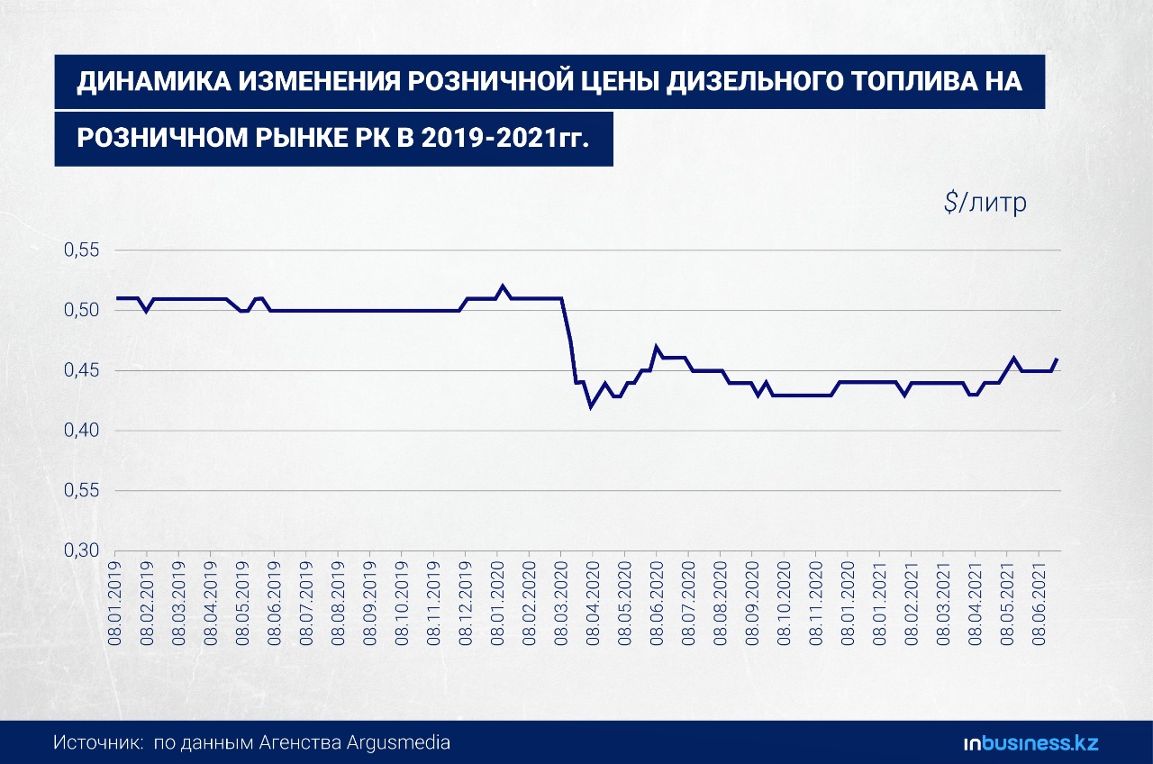 Историческая розничная цена на дизельное топливо в Казахстане составляла около 0,50 $/литр, что соответствовало минимальной эффективности переработки нефти на НПЗ РК и обеспечению внутреннего рынка нефтепродуктами. Учитывая текущий курс национальной валюты, это составляет около 210 тг/литр.