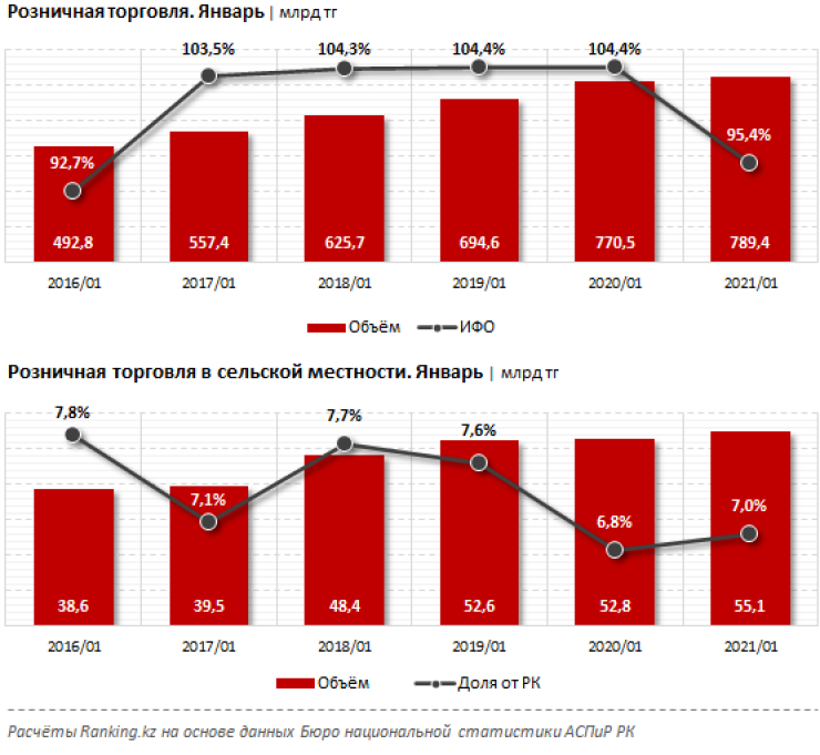 На сельскую местность, по официальным данным, приходится лишь семь процентов розничных продаж: за январь — 55,1 миллиарда тенге. Ситуация мало изменилась с января 2020 года, когда официально проведенный по чекам объем ретейла в селах составлял 52,8 миллиарда тенге, или 6,8 процента от всей розничной торговли по Казахстану.