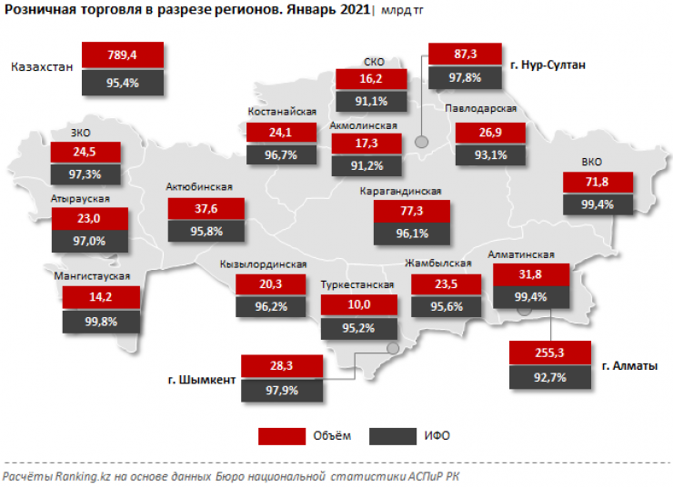 Индекс физического объема в регионах Казахстана варьировался от 91,1 до 99,8 процента, однако ни в одном не дотянул до 100 процентов, что говорит о повсеместном упадке реальных показателей ретейла.