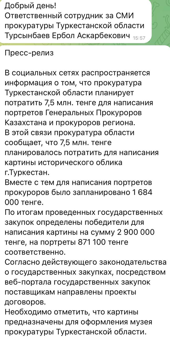 Поставщикам уже направлены проекты договоров. Уточняется, что картины предназначены для экспозиции музея прокуратуры Туркестанской области.