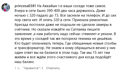 "Мы жители города Караганды, Пришахтинск, улица Галантерейная. Всё время у нас проблемы с электричеством. Чуть ветер подует – пол-улицы остаётся без света. Для другой половины улицы поставили новый трансформатор несколько лет назад, а до нас так и не дошли. 29.08.2023 в районе пяти часов вечера снова был перепад электричества, домашний трансформатор показал 390 вольт. Почти в каждом доме перегорела бытовая техника — телевизоры, холодильники, компьютеры и т.д . Все и так в кредитах, а тут такое… И это уже не в первый раз за месяц. Хотим хоть как-то обратить внимание на нашу половину улицы — как заколдованный угол, до которого никому нет дела…" — пожаловался подписчик.
