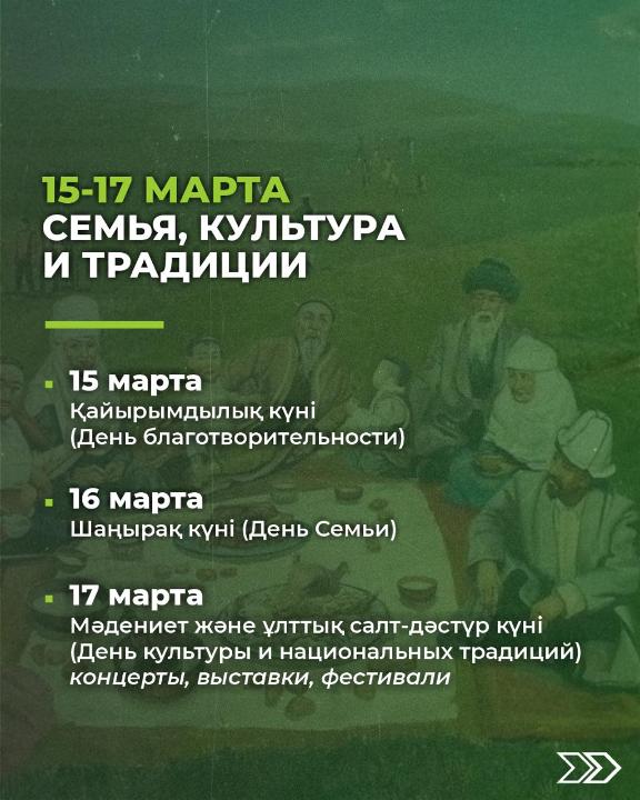 Тематические дни «Көрісу – Амал мерекесі» (день приветствий, теплых встреч и добрых пожеланий), «Қайырымдылық» (день благотворительности), «Мәдениет және ұлттық салт-дәстүр» (день культуры и национальных традиций), «Шаңырақ» (день семьи), «Ұлттық киім» (день национальной одежды), «Жаңару» (день обновления), «Ұлттық спорт» (день национальных видов спорта), «Ынтымақ» (день единства и солидарности), «Жыл басы» (Новый год) и «Тазару» (день очищения) отражают важнейшие аспекты казахстанской культуры и ценностей.