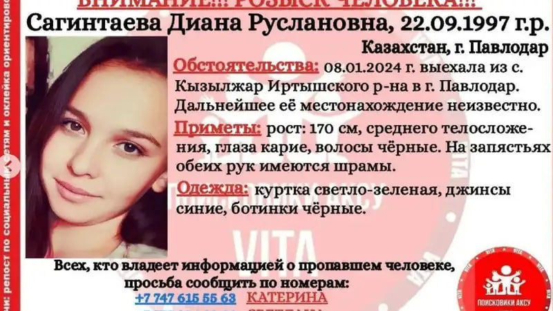 О пропаже Дианы Сагинтаевой сообщили волонтеры поискового отряда VITA.