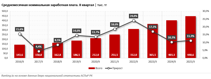 Согласно данным Бюро национальной статистики АСПиР РК, по итогам второго квартала 2025 года среднемесячная номинальная зарплата в стране составила 448,6 тыс. тг, в том числе в городской местности — 471 тыс. тг, в сельской — 381,7 тыс. тг, пишет Caravan.kz со ссылкой на Ranking.kz.