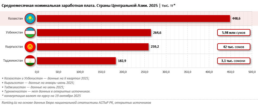 В целом уровень зарплат в Казахстане остаётся наивысшим среди стран Центральной Азии и значительно превышает средние показатели по региону. Так, среднемесячная номинальная заработная плата в РК (448,6 тыс. тг) примерно на 70% больше, чем в Узбекистане (около 265 тыс. тг), на 73% больше, чем в Кыргызстане (259,2 тыс. тг), и почти в 2,5 раза больше, чем в Таджикистане.