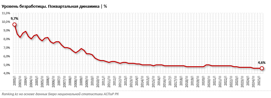 По сравнению со вторым кварталом прошлого года численность занятых в РК выросла на 110,1 тыс. человек, а численность безработных, наоборот, сократилась на 2,2 тыс. человек. Кроме того, за год наблюдается снижение уровня молодёжной безработицы: с 3,2% во втором квартале 2024 года до 3,1% во втором квартале 2025-го.