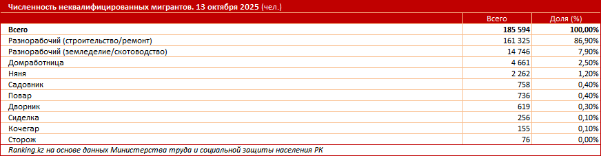 Пока местные жители отдают предпочтение поиску «лёгкой работы с высокой оплатой», рабочие и технические должности занимают мигранты. По состоянию на 13 октября 2025 года в РК зарегистрированы 185,6 тыс. трудовых мигрантов, занятых в основном на неквалифицированных и физически тяжёлых работах: