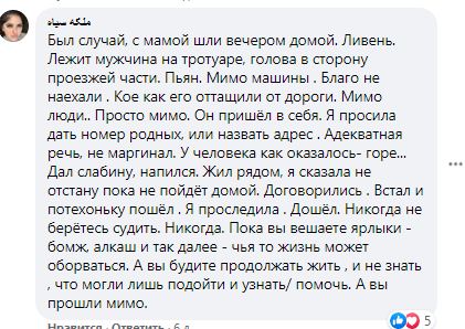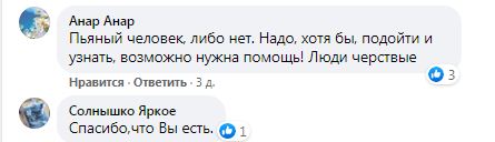 «Пьяный человек, либо нет – надо хотя бы подойти и узнать, нужна ли помощь», «Спасибо, что вы есть», «Мало ли что, человек ведь», «Пока вешаете ярлыки – бомж, алкоголик, чья-то жизнь может оборваться», — пишут алматинцы в комментариях к публикации.