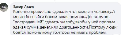 "Конечно, правильно сделали, что помогли человеку. А могла бы выйти боком такая помощь. Достаточно "пострадавшей" сделать жалобу, якобы у неё пропала этакая сумма денег или драгоценности. Поэтому люди боятся помочь кому-то, чтобы не иметь проблем", — выразил свое мнение один из участников группы.