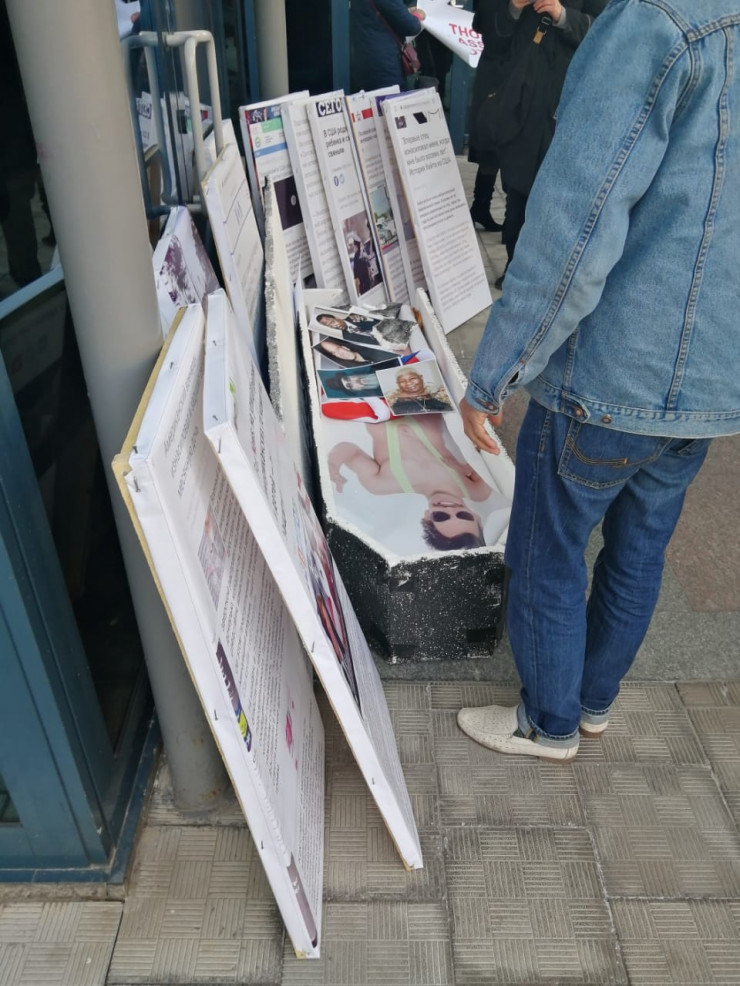 У здания генконсульства собралось около 20 активистов. На плакатах, которые они принесли, написано: "Чья бы корова мычала", "Пусть прекратят оскорблять казахов, которые живут в Америке" и так далее.