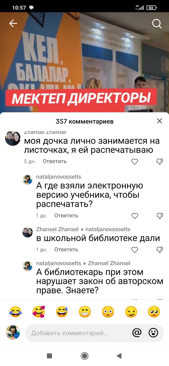 – Самое обидное, что был наказан библиотекарь школы. В ответе УО Алматы сказано, что на библиотекаря наложили дисциплинарное взыскание. То есть в том, что управление образования отказало этому самому библиотекарю в приобретении учебников казахского языка, виноват сам библиотекарь? Библиотекарь сама ничего не могла сделать в этой ситуации, поэтому считаем ее наказание абсолютно необоснованным. Директор школы был назначен только в январе, он точно не виноват. А вот завучи? Есть же курирующий библиотеку завуч. Почему он полгода молчал? Учитель казахского языка, которая, вместо того, чтобы бить тревогу, полгода молчит и копирует детям учебник. Кстати, ксерокопирование – это нарушение авторских прав, но это никого не напрягает. Все спокойно занимаются по листочкам-ксерокопиям. Даже родителям раздают пиратские копии отсканированного учебника, чтобы те могли распечатать своим детям. Вот посмотрите, как комментируют сами родители изучение государственного языка по ксерокопиям и распечатанным «на коленке» учебникам: