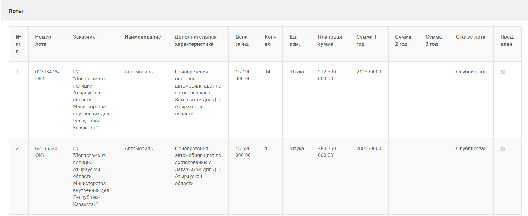 "Заказчик – ГУ «Департамент полиции Атырауской области министерства внутренних дел Республики Казахстан»; наименование – автомобиль; дополнительная характеристика – приобретение легкового автомобиля, цвет по согласованию с заказчиком для ДП Атырауской области; цена за единицу – 18,6 млн; количество – 15; плановая сумма –280,3 млн", — говорится в описании лота на сайте госзакупок РК.