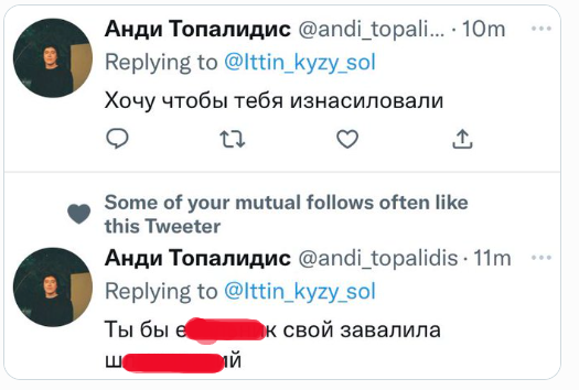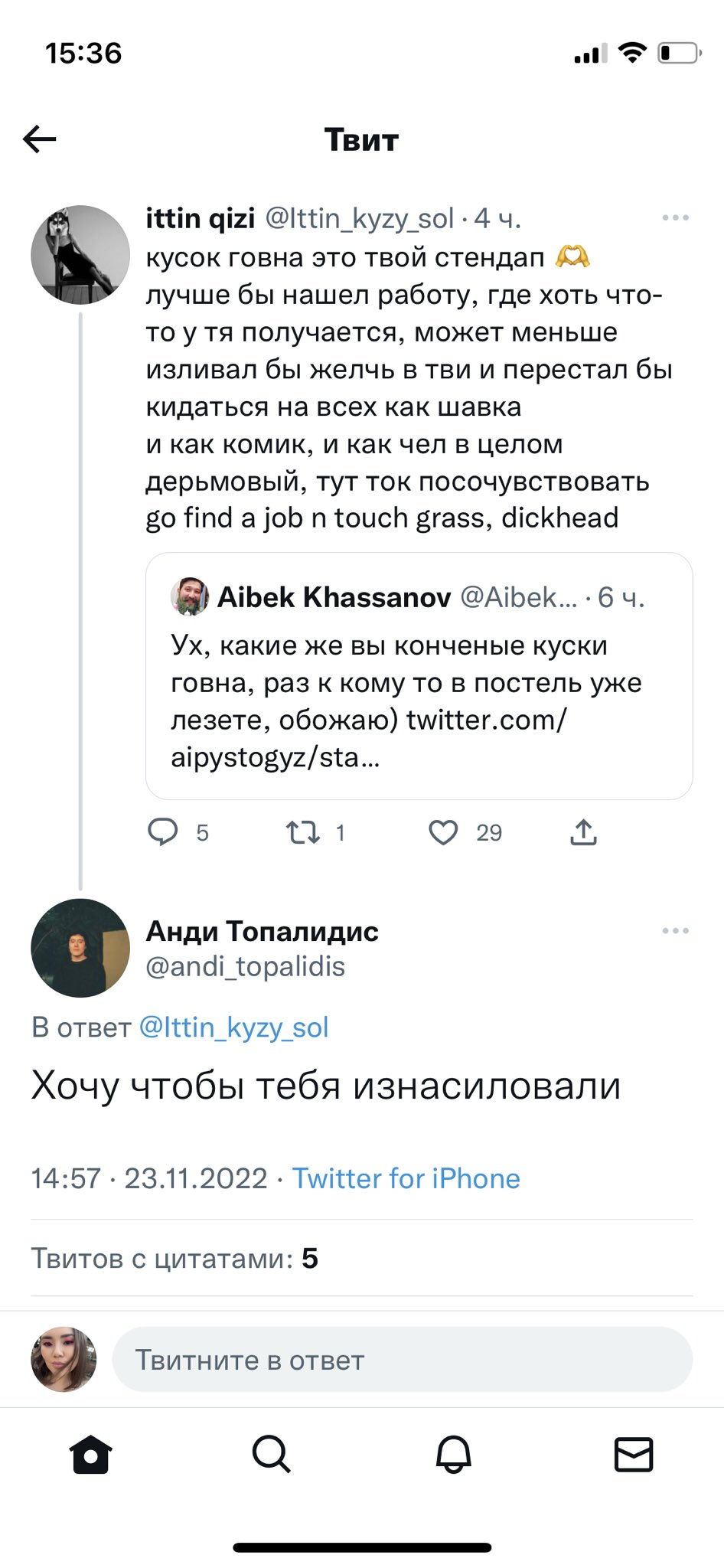Сейчас этот твит уже недоступен, однако в Интернете остались скриншоты. На них после грубой критики со стороны пользовательницы ittin_qizi стендапер написал, что хочет, чтобы её изнасиловали.