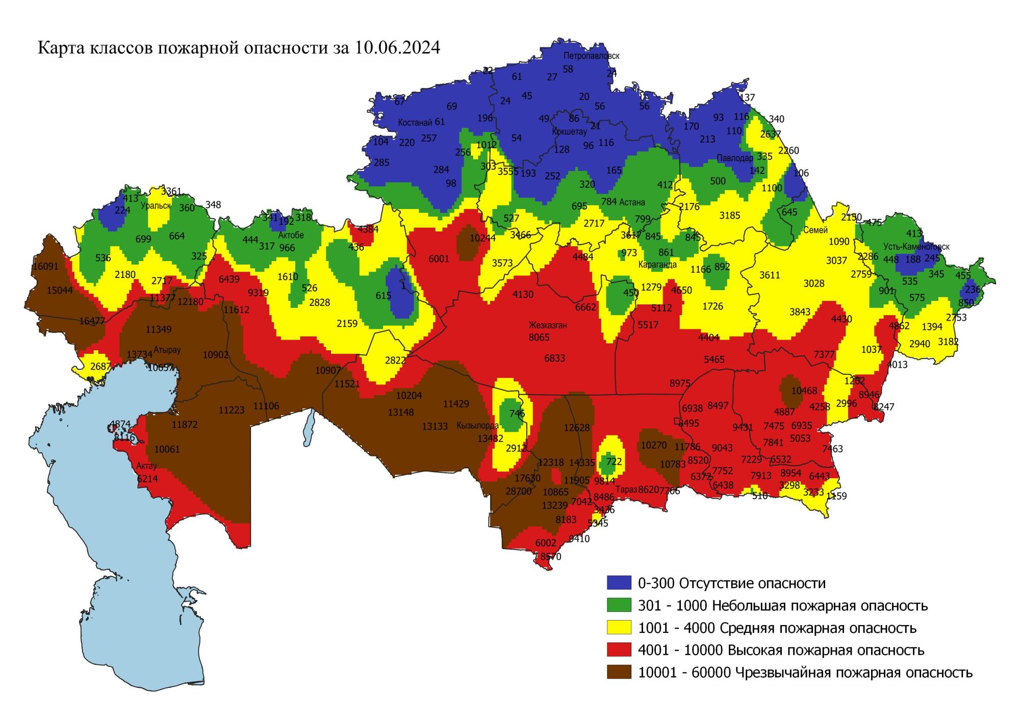 В Мангыстауской, Туркестанской, Жамбылской, Алматинской областях и в областях Жетысу, Улытау, на западе, севере Кызылординской, на западе Актюбинской, на юге Костанайской, Западно-Казахстанской и области Абай, на юге, в центре Карагандинской области сохраняется высокая пожарная опасность.