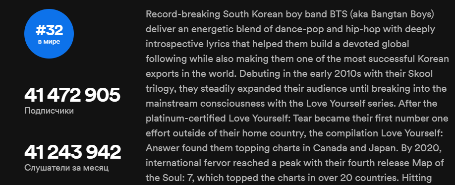 Южнокорейский поп-бэнд вполне заслуженно называют одним из самых трендовых коллективов в мире. В прошлом году их фан-база насчитывала более 48 миллионов человек по всему миру. Разумеется, со временем этот показатель только растет. Например, на официальной странице в Instagram у группы более 52 миллионов подписчиков.