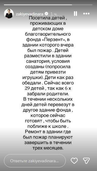 «Сейчас всего 29 детей, так как шестерых забрали родители. В течение нескольких дней их перевезут в другое здание фонда, которое готовят, чтобы оно было ближе к школе», — сообщила Закиева в своём Instagram.